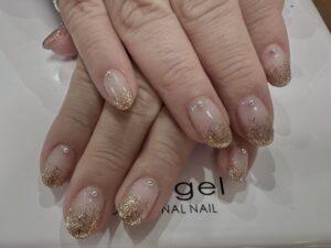 ゴールドの少しザクザクしたラメのグラデの施術しましたが、可愛かったです~