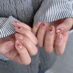 こんにちは!ブログ担当本田です💁♀️ 今回はほんのり透け感のあるヌーディーピンクに、さりげないラメをまとわせた大人可愛いデザインです♪