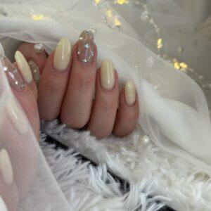 やわらかなアイボリーカラーをベースにした、大人可愛い上品ネイルのご紹介です♪