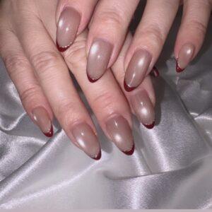 締め色にボルドーで細フレンチ、繊細なラメで囲うことでよりフレンチが映える色設計。