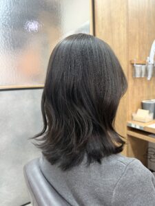 スタイルはミディアムベースに、毛先に軽さと動きを出して、巻いたときに抜け感が出るように仕上げています。