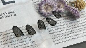 本日ご紹介するのは、シアーグレーにブラックドットを合わせた大人可愛いデザインです♪やわらかな透け感のあるグレーカラーは、肌なじみが良く、どんなシーンにも合わせやすい万能カラー☆