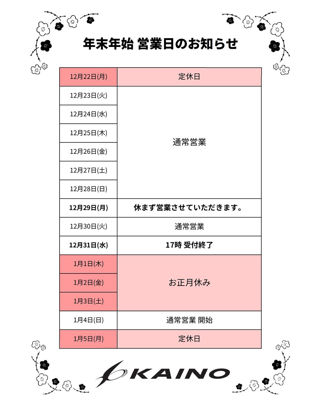 年末はイベントも多い季節ですが、KAINOではスタッフ全員、いつも通り元気に営業中✨ぜひ気軽にキレイのメンテナンスにお越しください😊