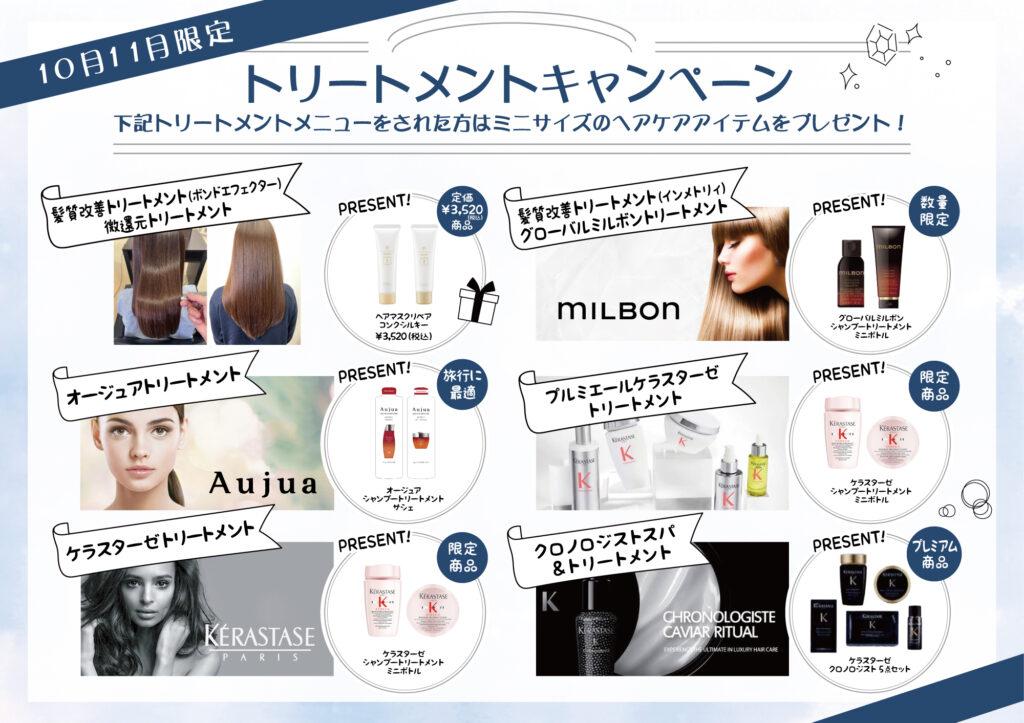 そこで10月11月限定でトリートメントメニューをご利用いただいたお客様に、ミニサイズのヘアケアアイテムをプレゼントいたします🎁